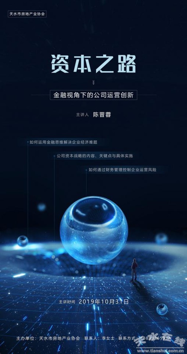 天水市房地产业协会特邀纵横资本市场、管理数百亿资本的实战专家——陈晋蓉教授亲临授课,让您的企业跨过融资高山、扭动转型魔方,促使企业走向广阔舞台,以澎湃的动力助推经济高质量发展!