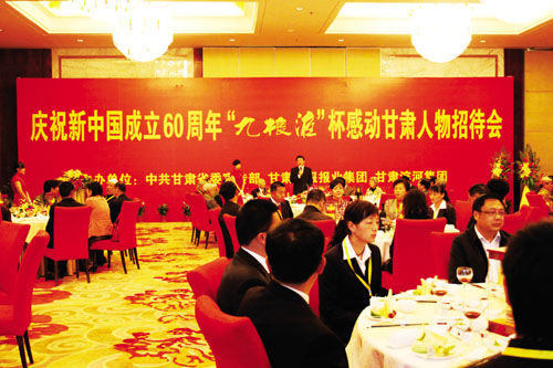 9月30日,兰州宁卧庄宾馆流光溢彩,绚丽辉煌。为庆祝新中国成立60周年,深入开展群众性爱国教育活动,由甘肃省委宣传部、甘肃日报报业集团、甘肃滨河集团联合主办,滨河集团“九粮液”品牌独家冠名的“九粮液杯”感动甘肃人物座谈会暨颁奖典礼在这里隆重举行。