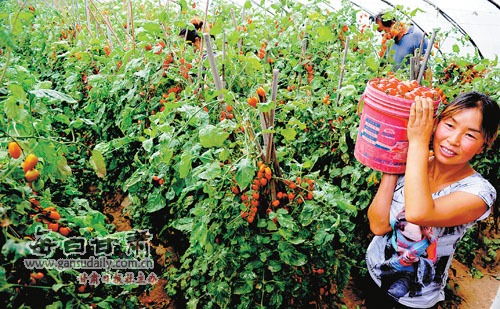 8月31日,永靖县太极镇大川村的一座蔬菜大棚里,菜农王雪莲和她的亲戚在忙活着采摘成熟的小西红柿。面对记者的采访,王雪莲道出了自己的辛苦:“种的这一棚小西红柿,地头价才每斤8角钱,除去浇水、化肥、人工费,收入就所剩无几了。”言语间流露出对菜价低迷的无奈。