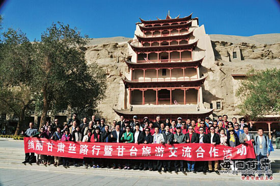 甘台旅游交流合作团在敦煌莫高窟前合影。