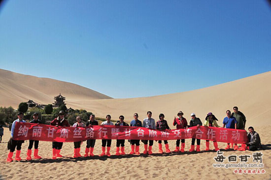 甘台旅游合作交流团体验敦煌鸣沙山、月牙泉美景。