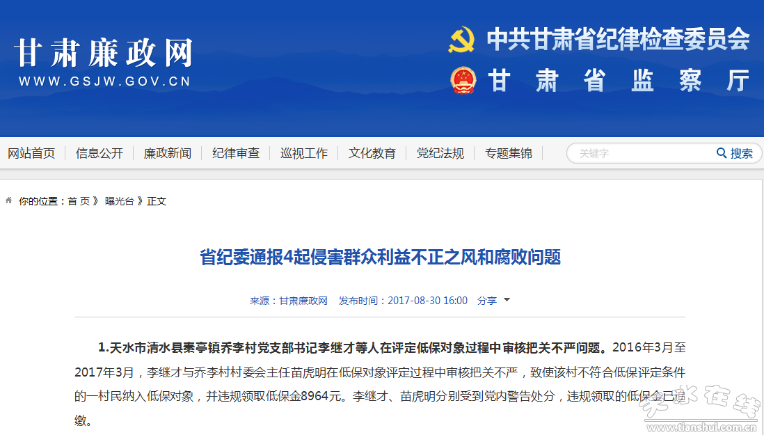 1.天水市清水县秦亭镇乔李村党支部书记李继才等人在评定低保对象过程中审核把关不严问题。2016年3月至2017年3月,李继才与乔李村村委会主任苗虎明在低保对象评定过程中审核把关不严,致使该村不符合低保评定条件的一村民纳入低保对象,并违规领取低保金8964元。李继才、苗虎明分别受到党内警告处分,违规领取的低保金已追缴。