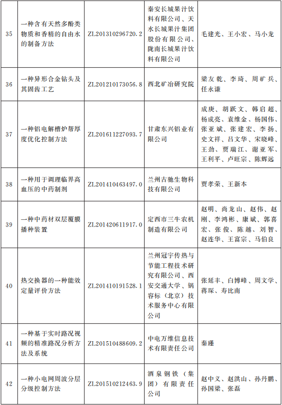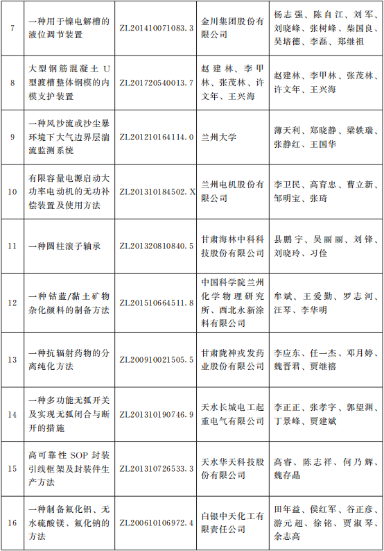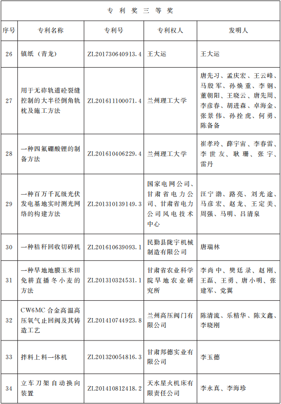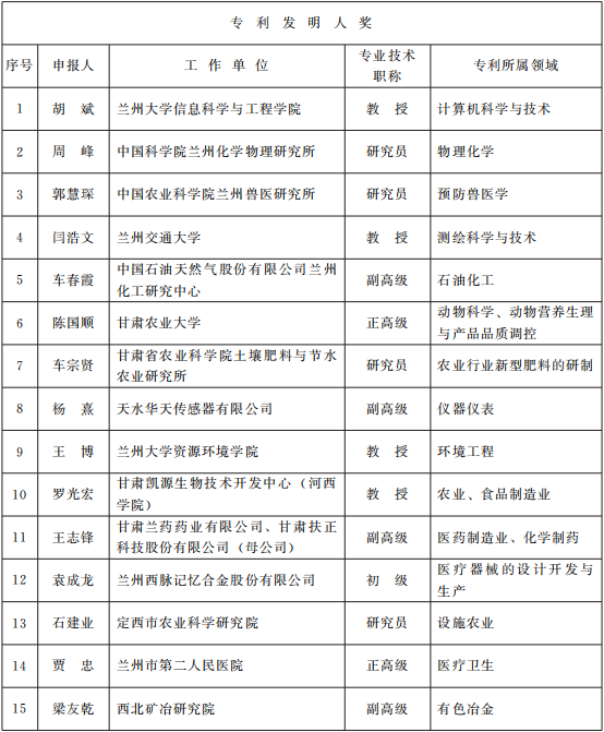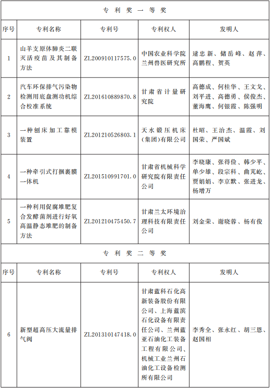 为鼓励发明创造,激发全社会创新活力,进一步加强知识产权保护工作,推动构建新发展格局,加快我省特色型知识产权强省建设,省政府决定,对在知识产权创造、运用和保护以及在促进创新和推动经济社会发展等方面做出突出贡献的专利权人和专利发明人给予表彰奖励。根据《甘肃省专利奖励办法》(甘肃省人民政府令第148号)规定,经评审,授予:
