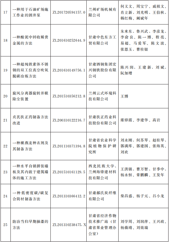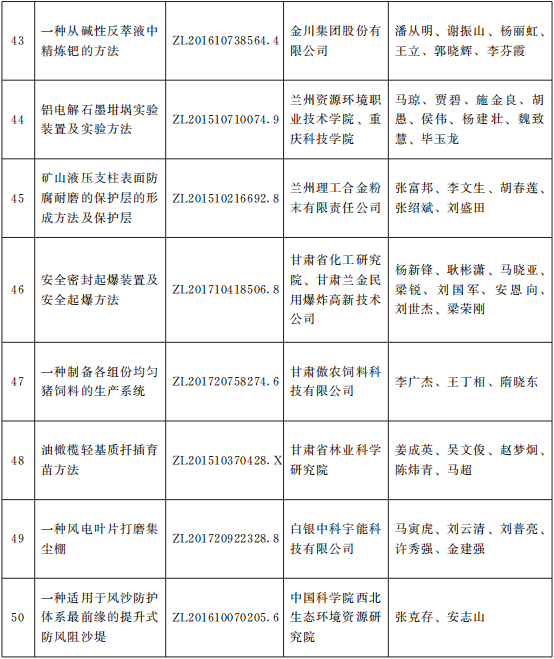甘肃省人民政府关于2020年度甘肃省专利奖励的决定