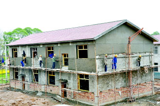 甘谷县新兴镇雒家村把灾后重建与新农村建设相结合,由兰大设计院设计的178平方米的两层新房,目前已经完成主体工程63户,全村86户受灾严重的群众不久将住上新宅。 记者 武军 摄