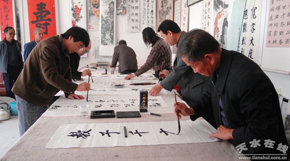 大石村只是甘谷县书画之村的代表之一,进年来,甘谷县把发展文化节产业作为满足人民多样化精神文化需求的主要途径,千方百计支持文化产业发展,一大批得改革开放风气之先的时代弄潮儿,开画廊办书店,内引外联多方交流,有效促进了文化产业的繁荣和发展。据了解,全县目前有书画装裱店88家,从业人员120多人,年书画产值交易1000余万元。书画店除装裱书画作品外,经常邀请北京、上海等地知名书画家来甘谷“文化塔台,经济唱戏”,每年邀请书画家达100多人。频繁的交流,有效促进了本地书法作品水平的整体提高,目前本地进行书画创作的队伍达150人之多。与文化产业有关的还有麻编鞋业,甘谷麻鞋历史悠久,麻鞋小作坊遍布城乡,甘谷县大漠行麻编鞋业有限公司采用农户+公司等生产方式,带动城乡一千余人就业,年生产麻鞋80万双,年产值230多万元,年出口创汇300万美元,成为甘谷文化产品的一张名片。