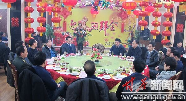 时值农历春节来临之际,1月18日,甘谷饭店宴会厅华灯璀璨,其乐融融,甘谷县举行2012年迎春团拜会。县委书记贾忠慧,县人大常委会主任衡彬,县委副书记、县长申君明,县政协主席王玺卿等县四大组织全体在家领导,各乡镇党委书记、乡镇长,县直各部门、垂管各单位主要负责人,各界代表欢聚一堂,回顾总结一年来的成绩,展望未来,共叙浓情,共谋发展,喜迎新春佳节。