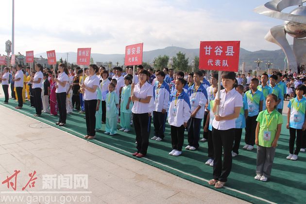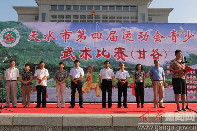8月9日,天水市第四届运动会青少年武术比赛在甘谷县冀城广场隆重举行开赛仪式,市四运会组委会主任、副市长霍卫平,市四运会组委会副主任、秘书长、市体育局局长黄啸,市旅游局局长王燕,市四运会组委会委员、市体育局副局长李爱平,甘谷县委书记贾忠慧,县委常委、宣传部长董珺,县人大常委会副主任韩金鼎,副县长潘慧琴,县政协副主席蒋晓琴出席开赛仪式,来自全市两区五县及市体育学校7个代表队的运动员、教练员、裁判员及甘谷县社会各界群众代表参加开赛仪式。