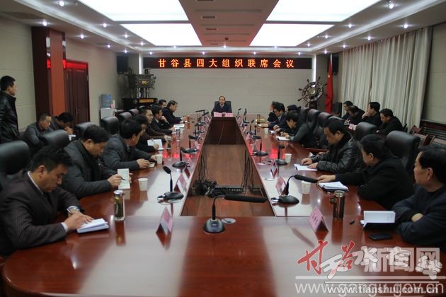 1月29日,甘谷县委书记贾忠慧主持召开四大组织联席会议,回顾总结了2013年经济社会发展所取得的重要成就,重点安排部署了2014年春节期间值班值守等各项工作。县四大组织在家领导及县委四大办主要负责人参加会议。