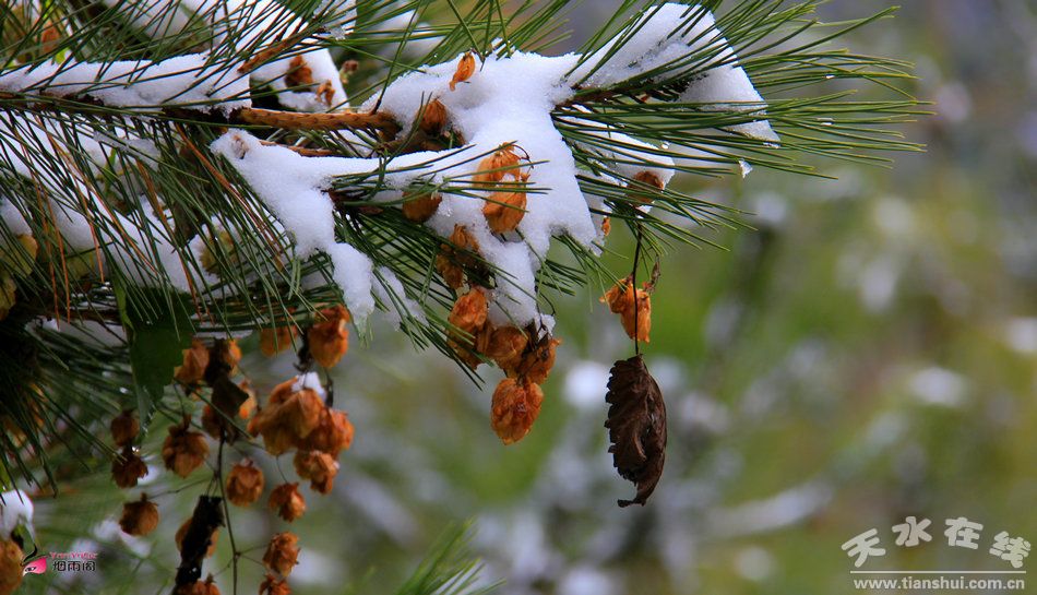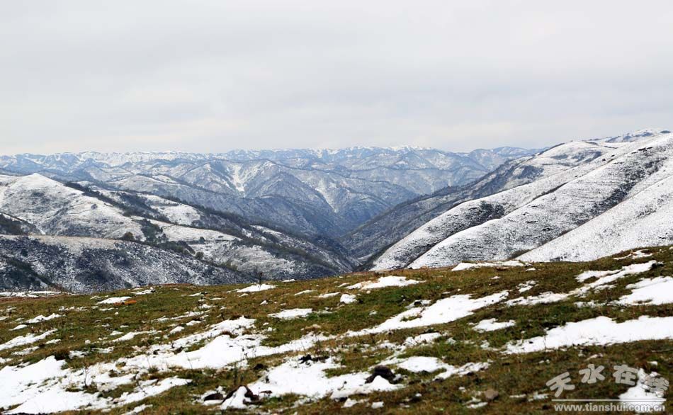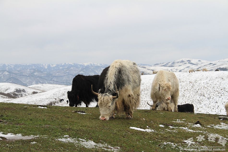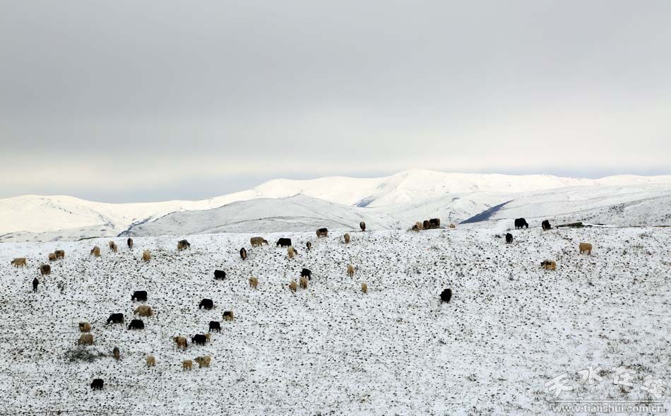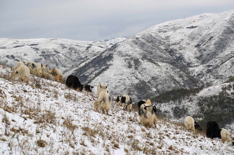 10月10日以来,甘肃出现今年入秋以来首场大范围降雪。位于天水市甘谷县的古坡草原一片银装素裹,胜似童话传说中的仙境一般美丽。高低错落的树木上,红、青、绿、黄各色叶片与蓝天白雪交相辉映,犹如一幅天然的水墨画。(网友“瞌睡虎”有感而发:薄雪落古原,霜色浸红黄。万里朗宇清,层林尽染绛。萧杀坡草疏,散漫觅食羊。苍松掩映处,青瓦赤砖墙。)