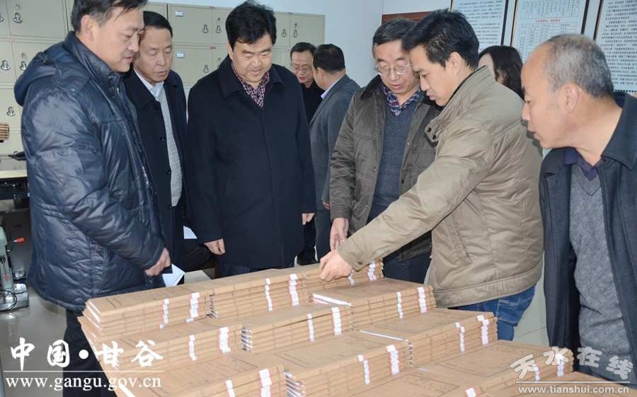 12月14日,甘肃省档案局副巡视员栗震中、临夏州档案局局长陈鹏一行深入甘谷县检查考核档案工作。天水市委副秘书长李虎生、市档案局局长陈世平、市档案局副局长王成成、副县长冯全敬及县档案局负责人陪同。