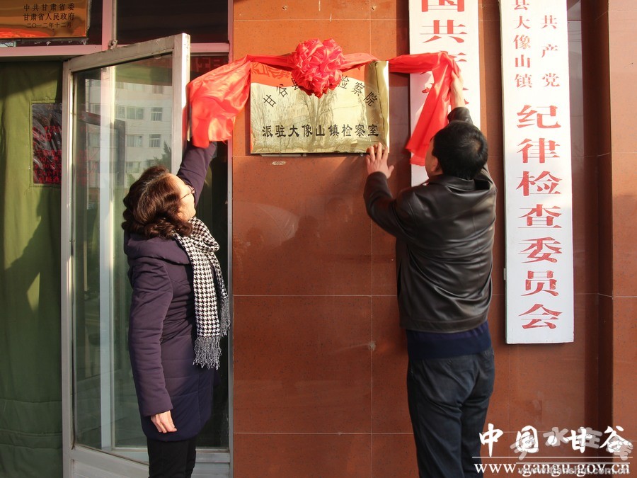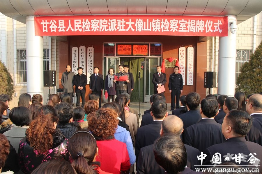 12月7日,甘谷县检察院派驻乡镇检察室揭牌仪式在大像山镇举行,标志着全县各乡镇检察室正式挂牌成立。市检察院党组成员、政治部主任高学斌,县委常委、政法委书记冯全敬,县检察院检察长姜云出席揭牌仪式;县委常委、大像山镇党委书记葛彦迪主持揭牌仪式;县委组织部、县法院、检察院有关负责人,各乡镇分管领导、大像山镇各站所负责人及县检察院全体干警共计60余人参加仪式。