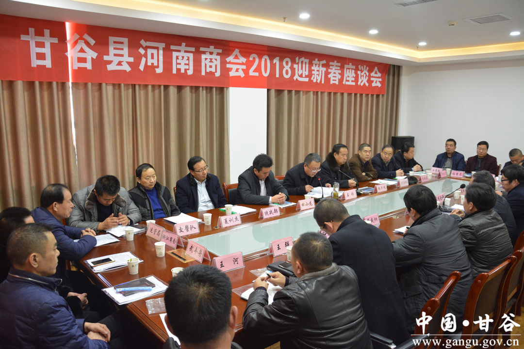 1月16日,甘谷县河南商会举行2018年迎新春座谈会,在甘谷创业的河南商会会员欢聚一堂,话新年、叙成就、谋发展。县委常委、统战部长王刚,县人大常委会副主任谢兴明,县政协副主席田小龙出席座谈会,县直有关部门负责人和部分在甘谷工作的河南籍人士参加座谈会。座谈会由甘谷县河南商会会长姚振明主持。