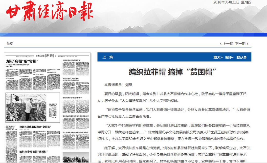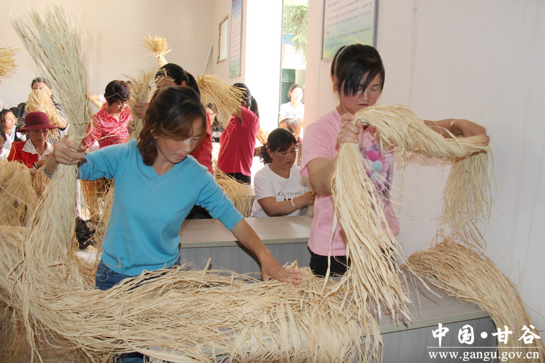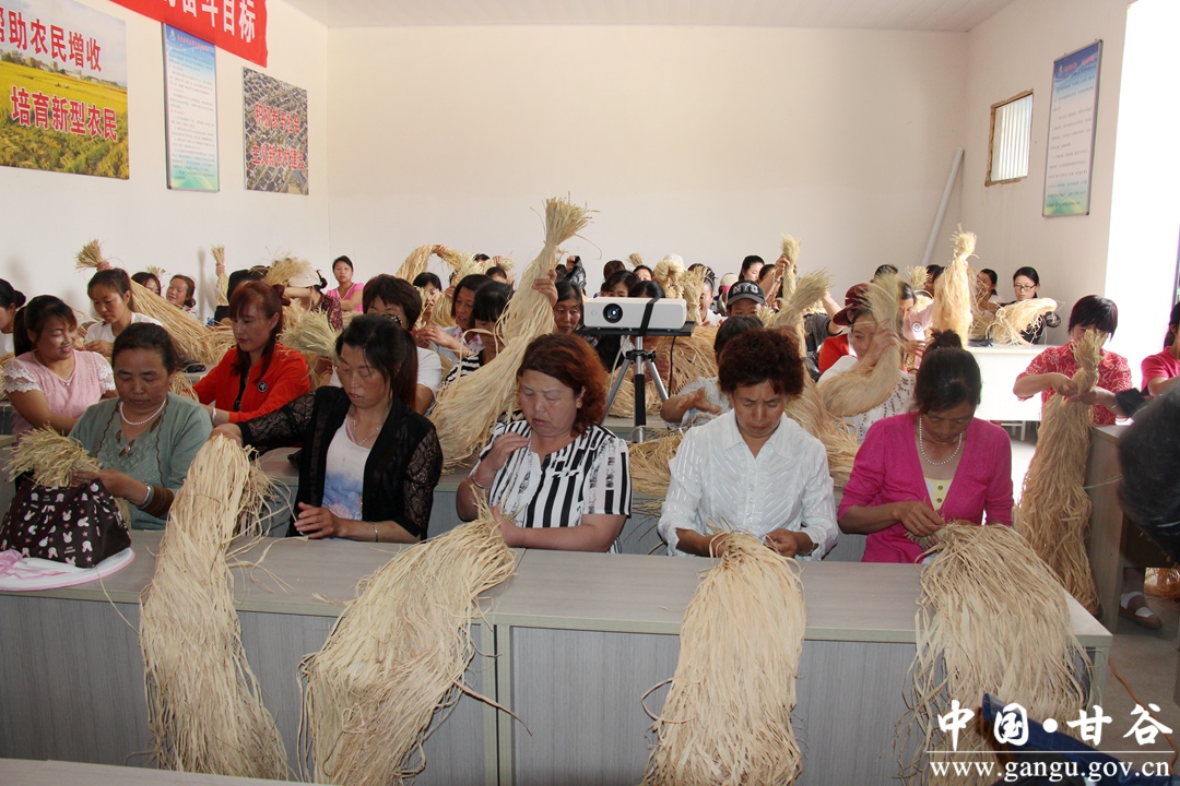 “大家手中的编织材料叫拉菲草,是从南非进口过来的,现在咱们把各自眼前的一小捆拉菲草从中间分开,照我这样盘起来……”甘肃陇原巧手文化发展有限公司负责人邓世贤正在向妇女们传授编织技术,扶贫车间里80余名妇女手中都拿着拉菲草,正在步调一致地跟随培训老师完成编织动作。