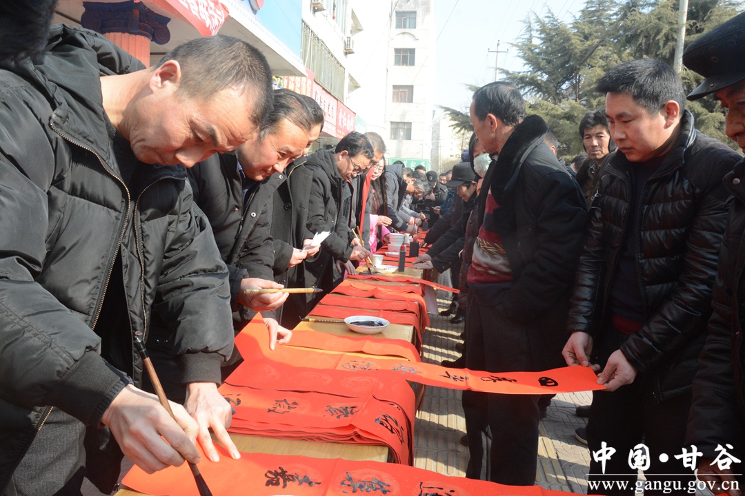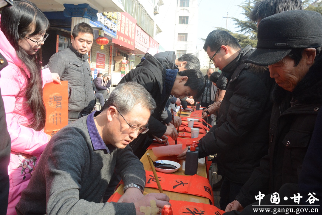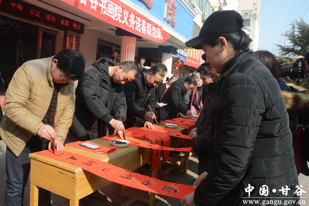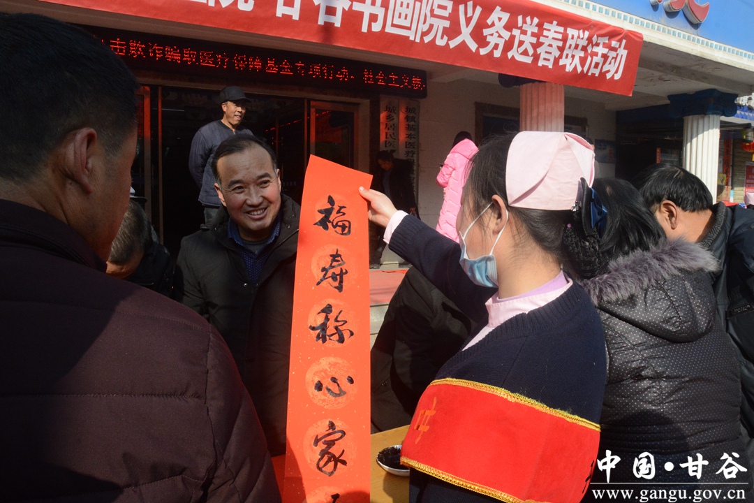 “这字真漂亮!这样的春联看着舒服,比买的印刷品好。”拿到春联的张先生高兴地说。在短短3小时的活动时间里,甘谷书画院的书法家们为广大市民免费书写春联500余副,受到群众一致好评。