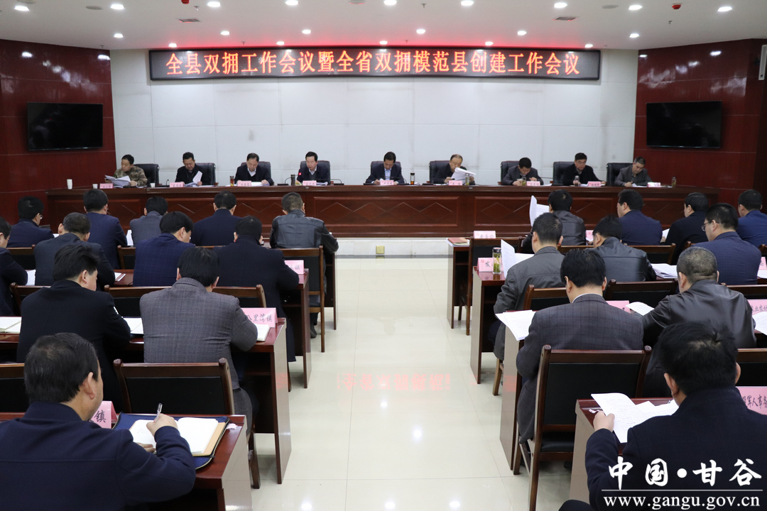 县委书记申君明主持会议并讲话;县委副书记、县长吴健讲话;县委常委、常务副县长孟晓龙宣读《甘谷县迎接全省双拥模范县考核验收工作实施方案》;县委常委、大像山镇党委书记葛彦迪,县委常委、副县长王志高,县人大常委会副主任颉明军,县政协副主席董德福、马清平,县人武部部长齐小军出席会议;各乡镇党委书记、乡镇长,县双拥工作领导小组成员单位主要负责人及县退役军人事务局全体干部共计80多人参加会议。