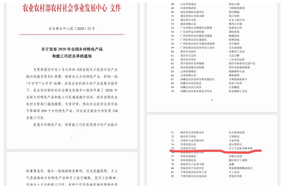 近日,农业农村部公布2020年全国乡村特色产品和能工巧匠名单,甘谷雅路人麻编鞋业有限公司手工千层底亚麻布鞋入选全国特色手工产品。