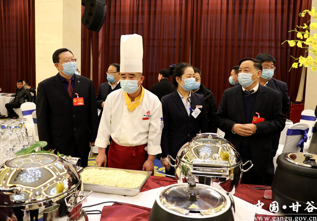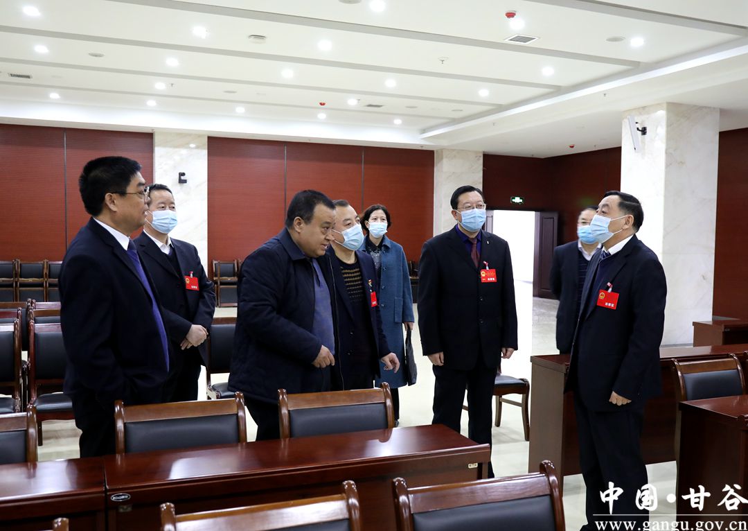 检查组一行先后前往统办楼会场、各代表团讨论点、甘谷大剧院会场、赤城国际大酒店,详细了解工作人员核酸检测、环境消杀、代表报到、代表食宿、会场布置等各项工作准备情况。