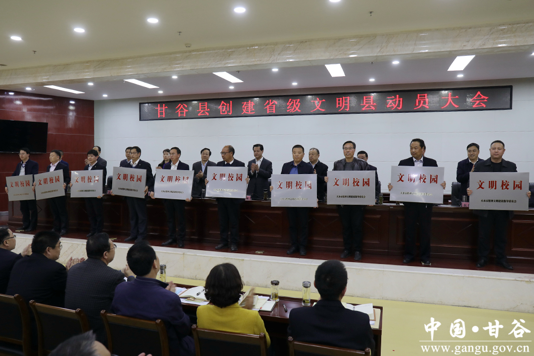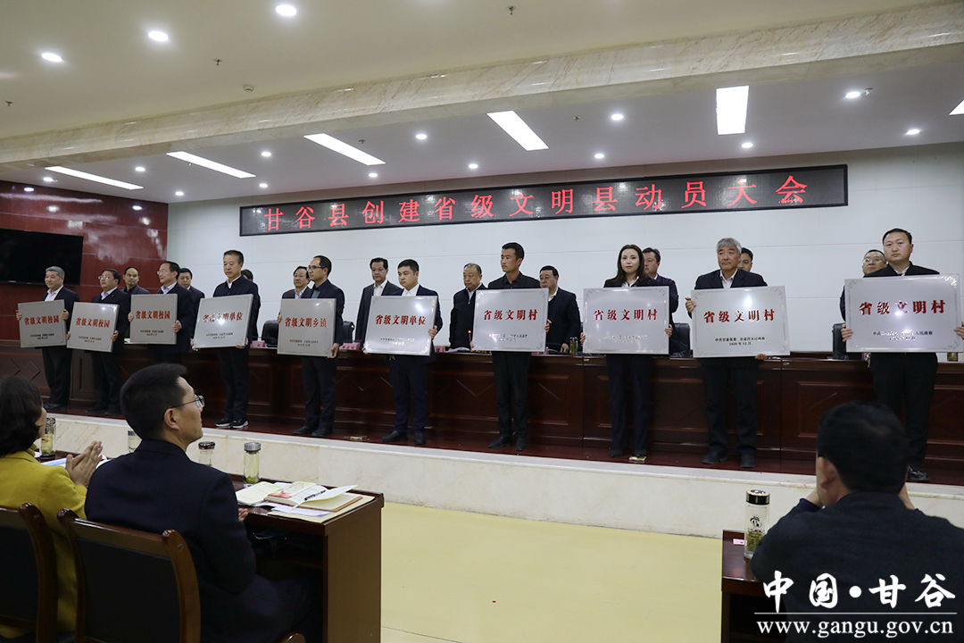 会上,县委常委、宣传部部长王亚梅宣读了《甘谷县创建省级文明县实施方案》;副县长牛武军宣读了《中共甘肃省委甘肃省人民政府关于命名表彰第十五批省级精神文明建设先进集体、先进工作者和第三届甘肃省文明家庭、第二届省级文明校园的决定》和《天水市精神文明建设指导委员会关于命名表彰第三届市级文明校园的决定》;对荣获省级文明村镇和省市级文明校园称号的单位进行了集中授牌;部分乡镇和部门作了表态发言。