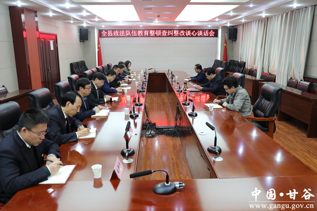 4月26日,市人大常委会副主任、甘谷县委书记、县政法队伍教育整顿领导小组组长申君明主持召开甘谷县政法队伍教育整顿查纠整改谈心谈话会议。县委常委、政法委书记、县政法队伍教育整顿领导小组常务副组长马福胜,副县长、县公安局局长、县政法队伍教育整顿领导小组副组长张涛,县法院院长、县政法队伍教育整顿领导小组副组长王建军,县检察院检察长、县政法队伍教育整顿领导小组副组长姜云,县司法局主要负责人和政法各单位常务副职参加谈心谈话。