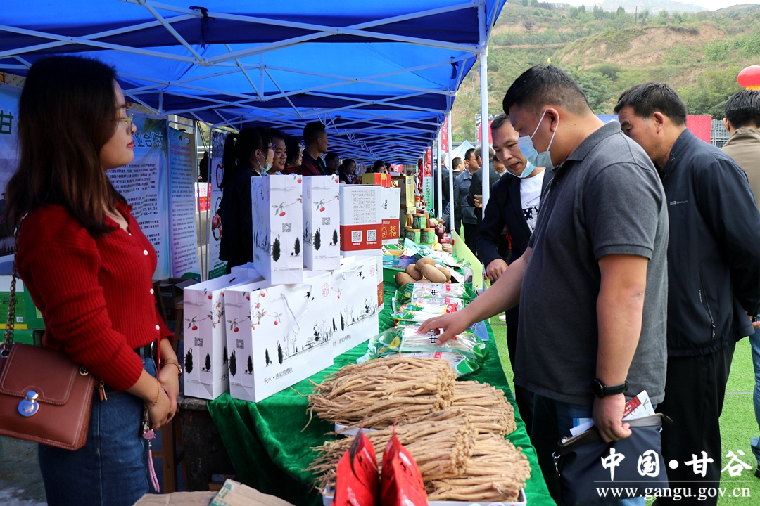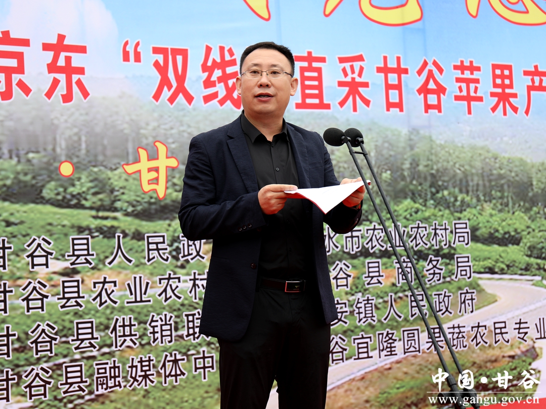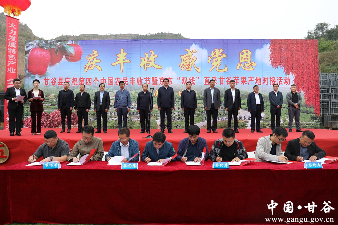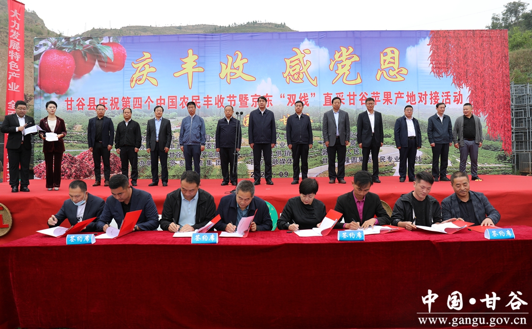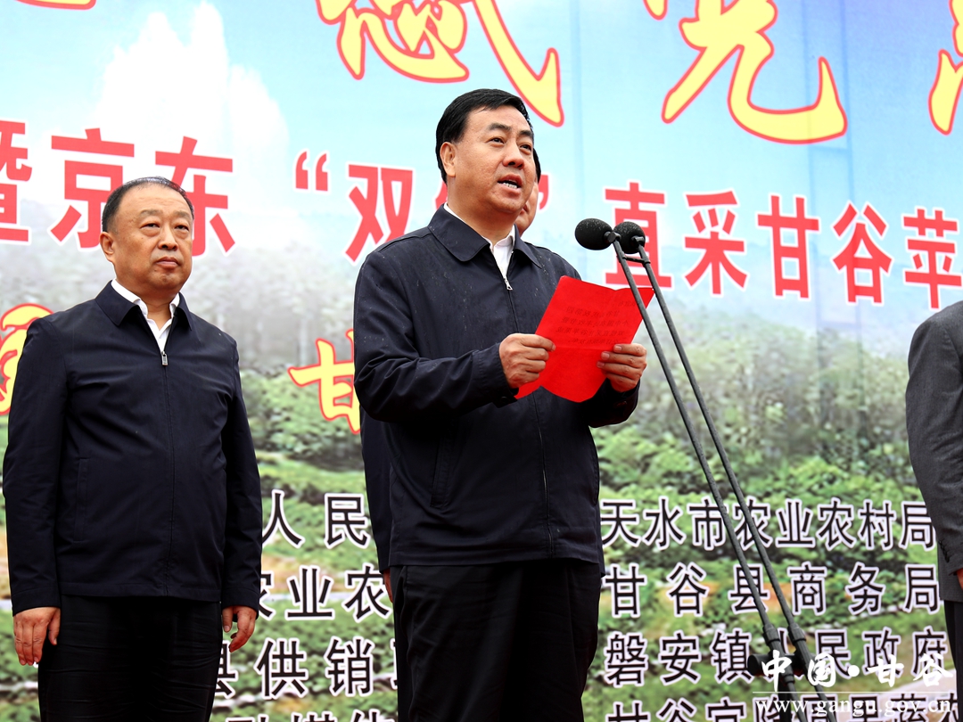9月17日,甘谷县庆祝第四个中国农民丰收节暨京东双线直采甘谷苹果对接活动在磐安镇东堡村举行。市委副书记杨小平宣布活动开幕,市政府党组成员逯克宗宣布苹果成交订单发车,县委书记吴健致辞,县委副书记、代县长孙忠平介绍甘谷果品产业发展情况,京东物流集团西北分公司副总经理王艳杰、上海万果会商务总监王力分别发言。