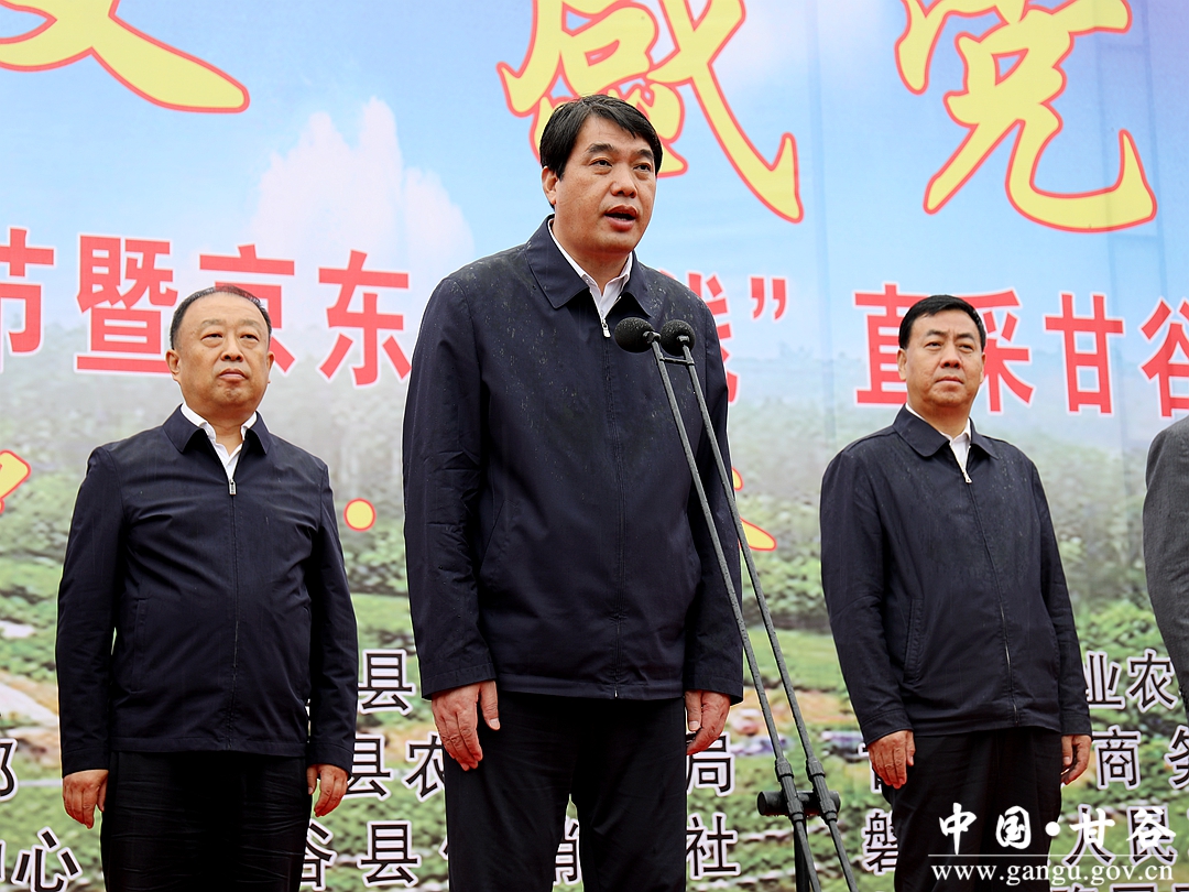 吴健在致辞中代表甘谷县四大组织,向各位领导、各位来宾及新闻界的朋友们表示热烈的欢迎和衷心的感谢,向全县农民朋友们致以亲切的问候和美好的祝福。他说,本次活动是甘谷县深入学习贯彻习近平总书记系列重要讲话精神,巩固拓展脱贫攻坚成果、接续推进乡村振兴的重要举措,更是全面建成小康社会后64万甘谷人民感党恩、听党话、跟党走的生动实践。甘谷县委、县政府始终把产业振兴作为乡村振兴的根本之策和长远之计,深入推进“4+2”农业产业振兴行动和现代丝路寒旱特色产业三年倍增计划,全县农业产业特色与优势逐步显现、规模和效益不断提升,苹果种植规模达到36万亩、花椒22万亩、蔬菜28.5万亩、辣椒4万亩、中药材10万亩,先后荣获“中国苹果之乡”“中国花椒之乡”“全国辣椒之乡”等称号。