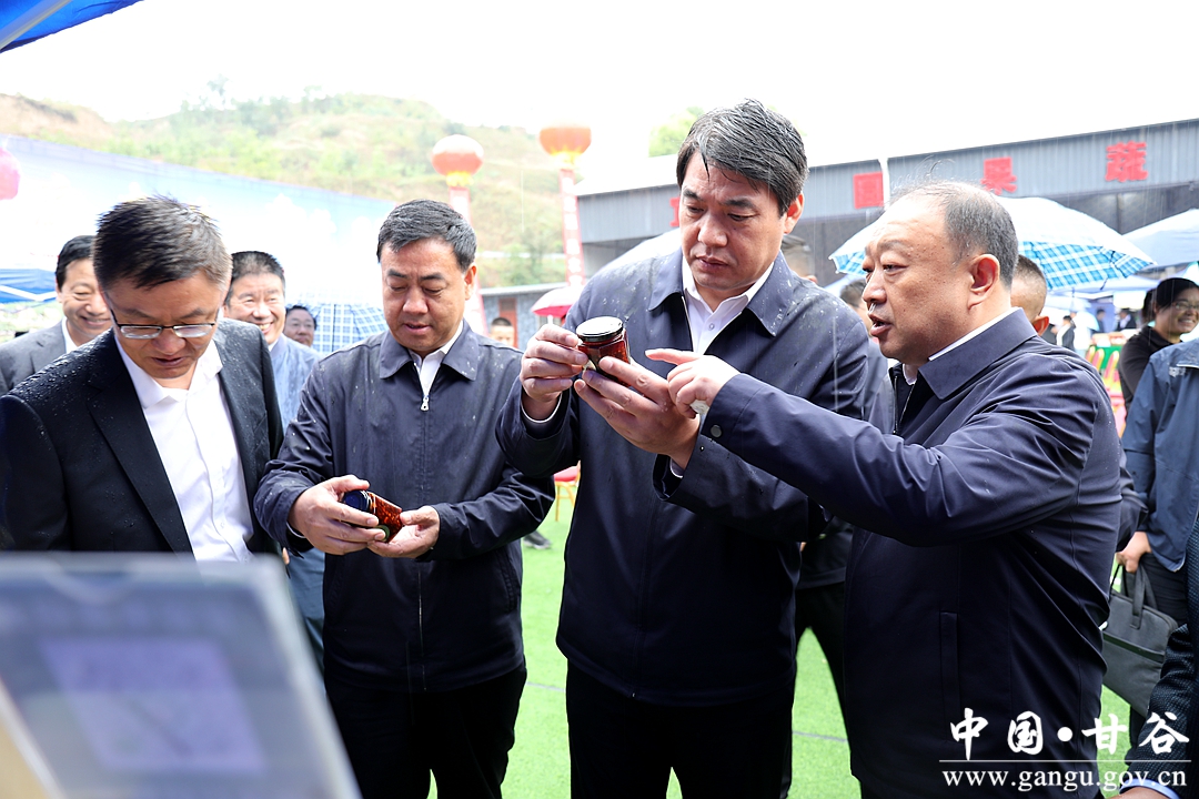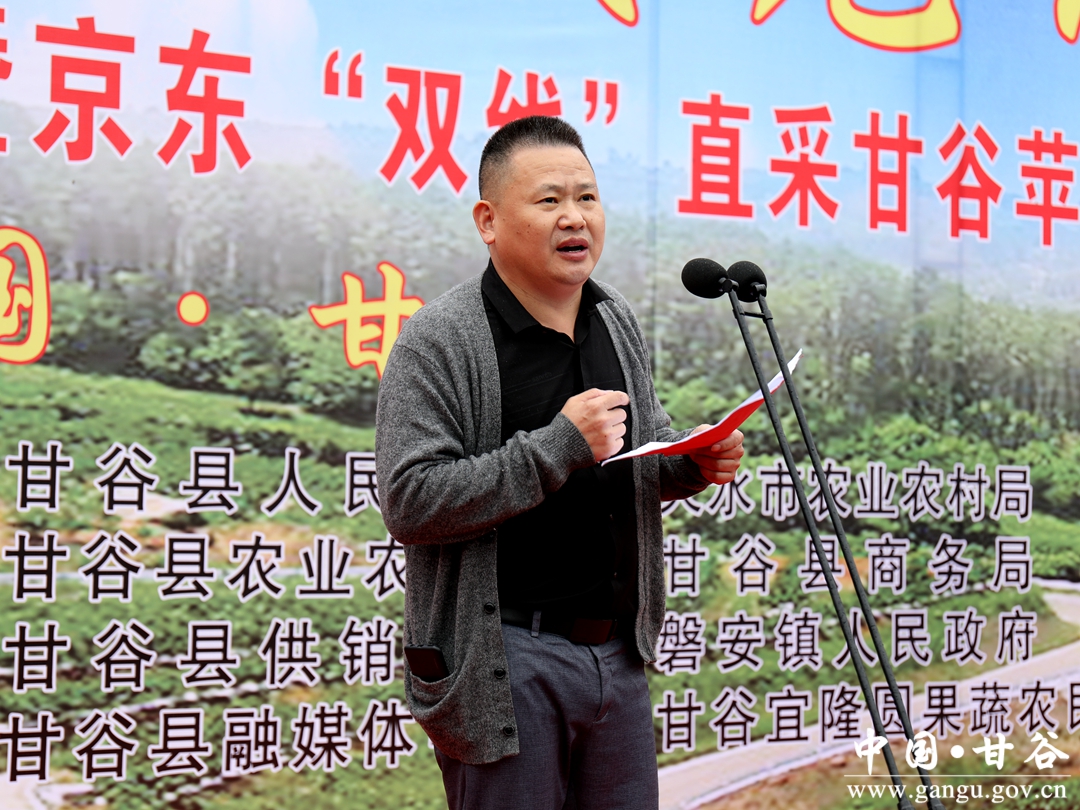 孙忠平在推介辞中说,近年来,甘谷县委、县政府依托资源禀赋,培育形成了果椒、蔬菜、养殖、劳务四大主导产业。尤其在苹果产业发展上,建基地、强龙头、育园区、创品牌、活市场、促增收,突出“绿色、无公害”,因地制宜、科学规划、规范种植,培育筛选优良品种,实施减农药、减化肥“双减”措施,倡导增施农家肥和有机肥,全力打造绿色优质果品,建成了八大果品产区,苹果种植面积达36万亩,总产量60余万吨,年产值18亿元,苹果产业已成为农民群众增收致富的主导产业。甘谷苹果主要有元帅、红富士两大系列,花牛苹果属元帅系列,果面红黑透亮,果型端正高桩,果肉脆甜多汁,果香浓郁芬芳,硬度适中,甜润可口,富含花青素、维生素和多种矿物质,是公认营养程度最高的健康水果之一,已成为享誉国内外的知名品牌。甘谷富士苹果着色红润、果面光洁、含糖量高、质脆香甜、贮藏期长,深受广大消费者的青睐。