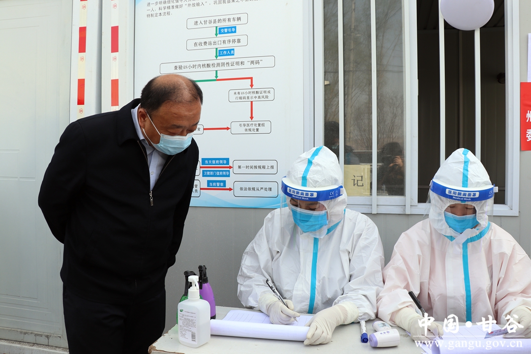 3月12日,甘谷县委书记吴健督查疫情防控工作,看望慰问坚守岗位的一线值守人员。他强调,要深入贯彻习近平总书记关于疫情防控的重要指示精神,全面落实党中央、国务院决策部署和省市委最新要求,更严更细更硬落实好各项防控措施,严把各类出入口,筑牢疫情防控坚固防线,决不能让来之不易的疫情防控成果前功尽弃,全力守护人民群众生命安全和身体健康。县委常委、政法委书记杜兴,副县长张涛、刘强、金辉一同督查。