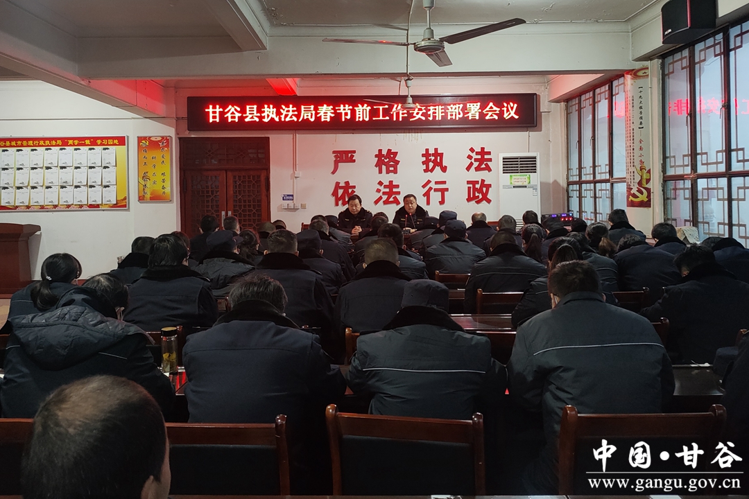 春节将至,为了全面落实县委县政府关于做好春节期间有关工作的指示,维护好城区市容秩序,营造干净、整洁、和谐、有序的节日环境,1月20日上午,甘谷县执法局召开春节期间工作安排部署会,重点对市容秩序、安全生产、应急保障、廉政建设等工作进行了安排部署。