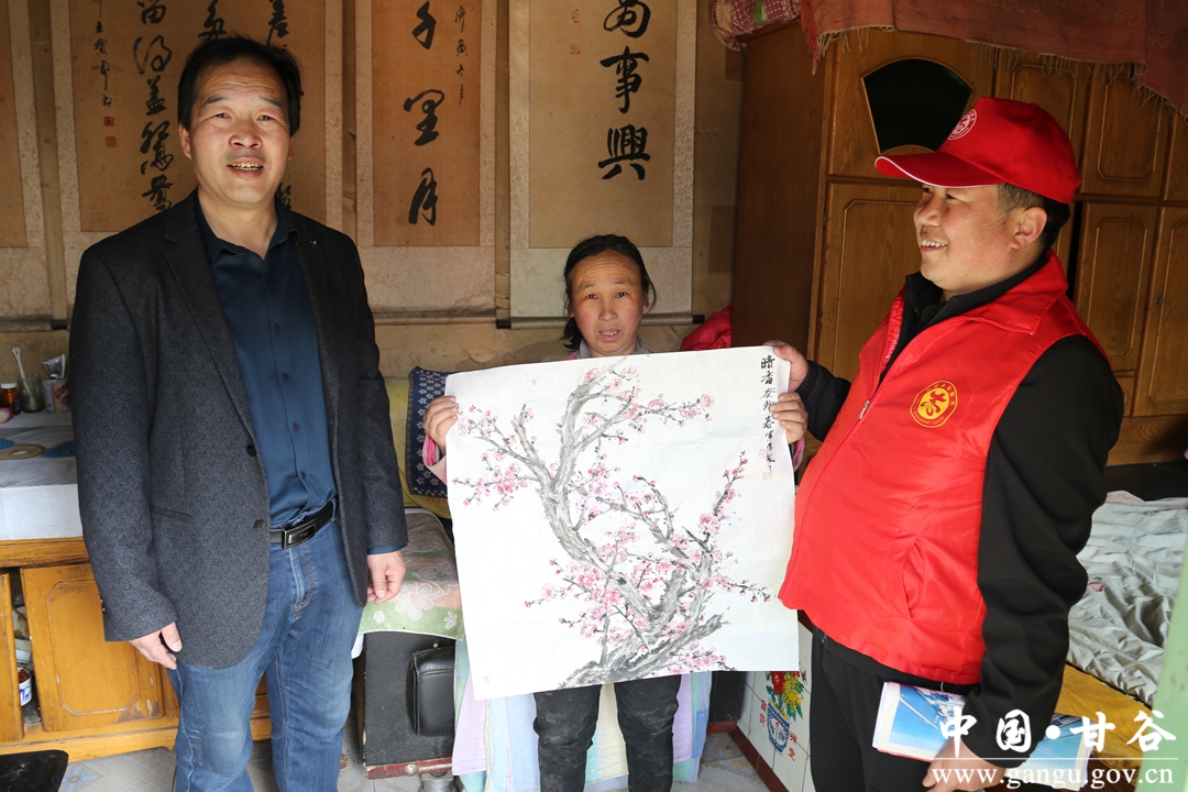 沙滩村的董来福老人今年80多岁了,是一名五保户老人,家中卫生状况较差。志愿者们一进门就撸起袖子开始忙碌,大家分好工,从环境清洁到地面打扫等,不一会儿房间就收拾得干净整洁。沙滩村驻村队员、甘谷三中教师李军伟还为他捐赠了自己的美术作品。尽管老人患有聋哑疾病不能说话,但临别时我们从他的眼神里似乎看到老人感动地说:“感谢志愿者们的辛勤付出!”随后志愿者们还到沙滩村老人梁海胜家里走访,并向他赠送了菜籽。在马坪村村民韩凤兰家里,李军伟老师也为她捐赠了自己的美术作品。