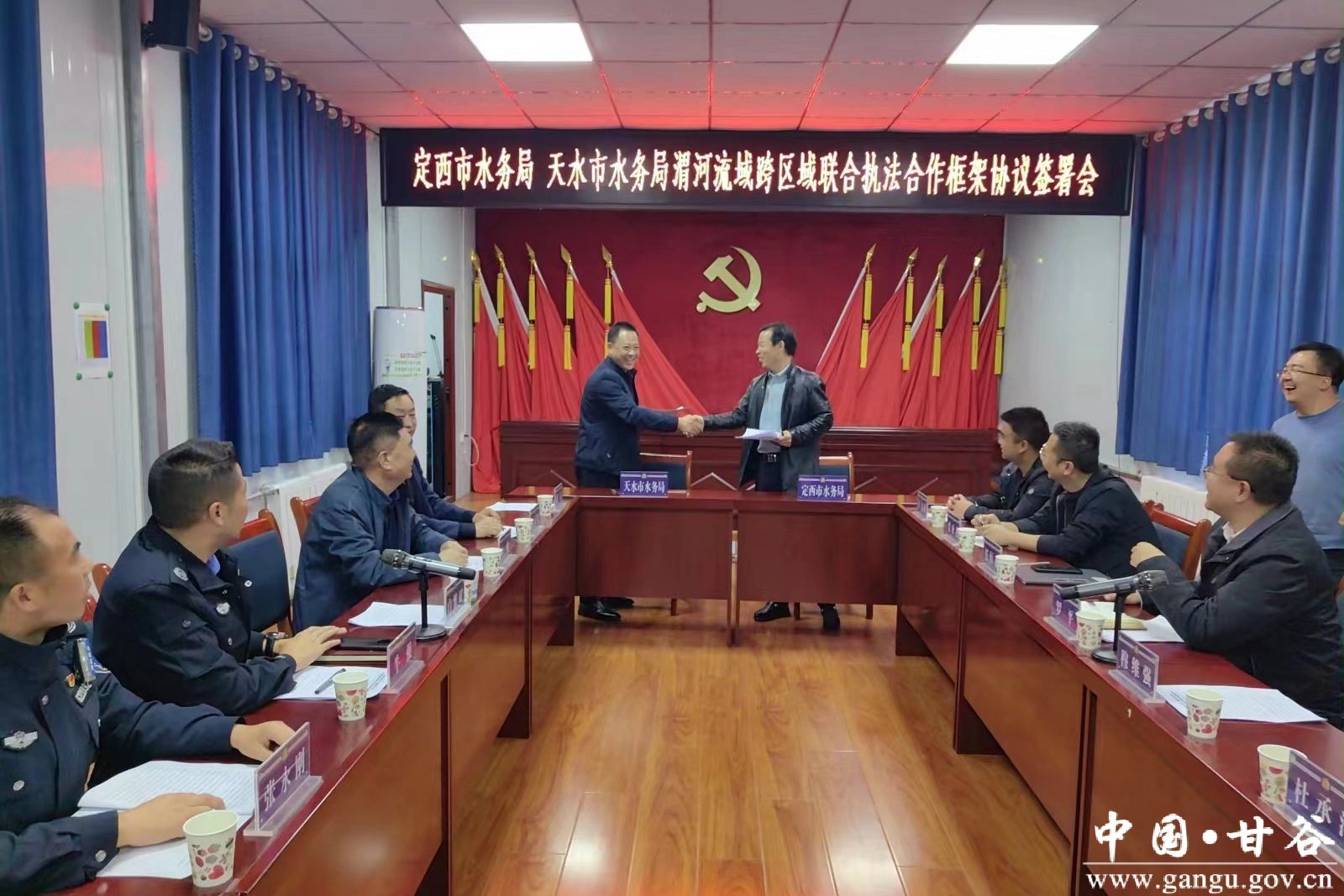 座谈会上,甘谷县水务局水政监察大队副大队长牛强分享了工作中关于全省示范单位创建、水行政执法制度建设、阵地建设、装备使用、案卷规范等方面的经验。定西市水务局与天水市水务局签订了《渭河流域跨区域联合执法合作框架协议书》,会后,与会人员前往渭河流域武山县与陇西县交界河道开展联合执法巡查工作,沿河查看了河道行洪和河道治理等情况,重点对非法采砂、非法取水、影响行洪建筑物等进行巡查。