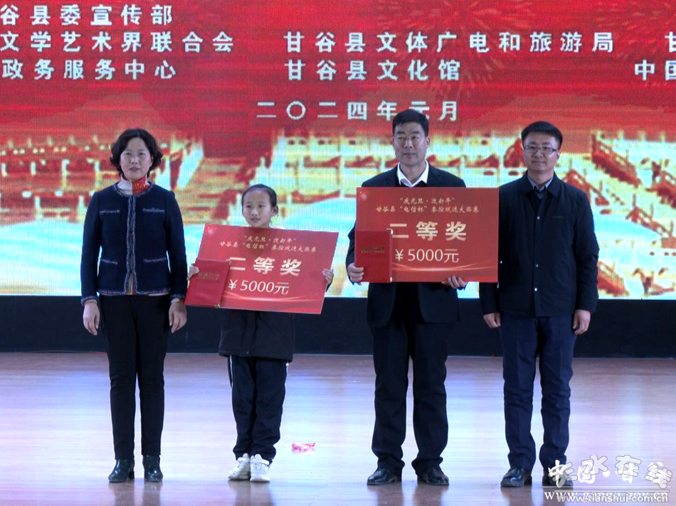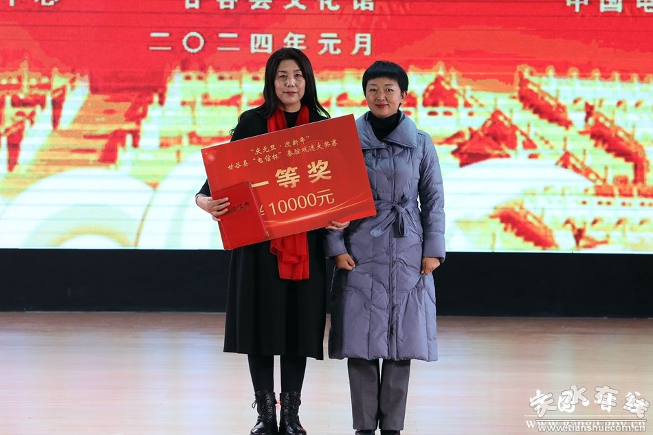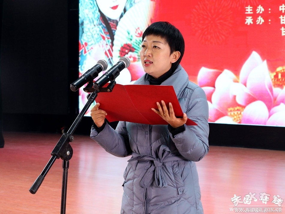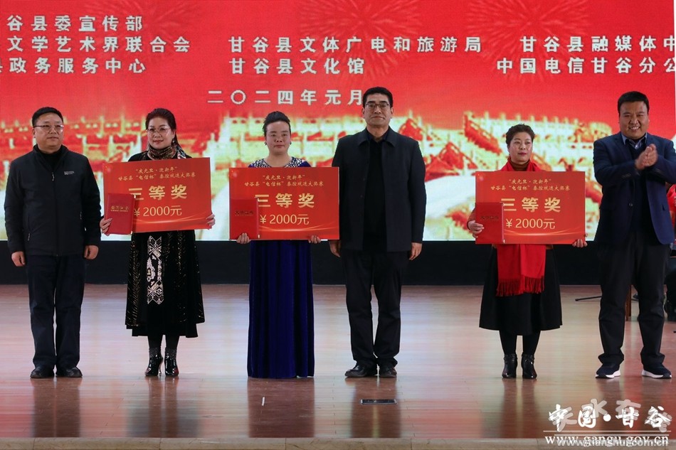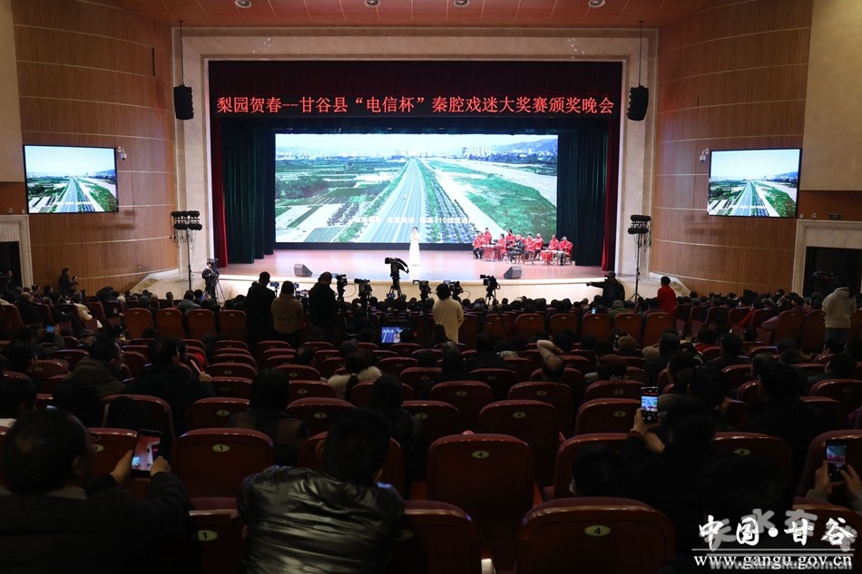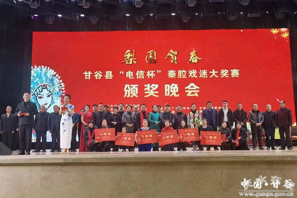 新甘谷讯【记者谢映波】1月4日,甘谷县举办“电信杯”秦腔戏迷大奖赛颁奖晚会。县委常委、宣传部部长范慧出席并致辞。县人大常委会副主任杨晓涛、副县长曲远风、县政协副主席李文定为获奖选手颁奖。