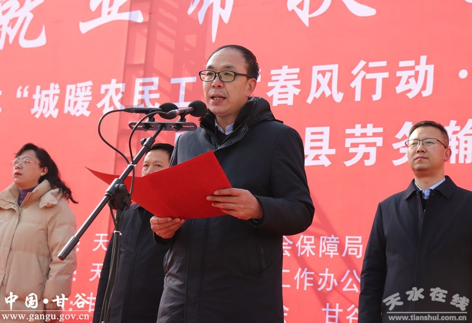 新甘谷讯【记者黄鑫】1月22日,天水市2024年“城暖农民工”“春风行动·就业援助月”专项服务活动启动仪式暨甘谷县劳务输转招聘会在大什字广场举行。天水市政府劳务办主任伏巨峰、副县长金辉出席活动。市政府劳务办相关科室、五县两区人社部门、劳务办负责人,县直相关部门和乡镇分管领导、乡镇劳务专干、村级劳务信息员以及社区工作人员,人力资源服务机构、培训学校和乡村就业工厂,帮扶车间负责人,用工企业和农民工代表共计500余人参加活动。