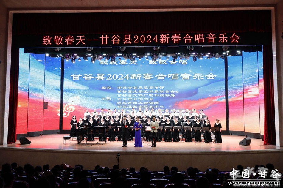 新甘谷讯【记者颉凤】为在认真贯彻落实党的二十大精神,深入践行习近平文化思想,推动文化繁荣发展,弘扬高雅艺术和经典文化,丰富春节市民文化生活。1月31日晚,由中共甘谷县委宣传部、甘谷县文学艺术联合会、甘谷县文体广电和旅游局主办,天水市合唱协会、天水市职工合唱团、甘谷县政务服务中心、甘肃省第五建设集团有限责任公司共同承办的致敬春天——甘谷县2024年新春合唱音乐会在甘谷县大剧院激情奏响。县人大常委会主任杨帆,县政协主席令军强,县委常委、宣传部部长范慧现场聆听了音乐会。