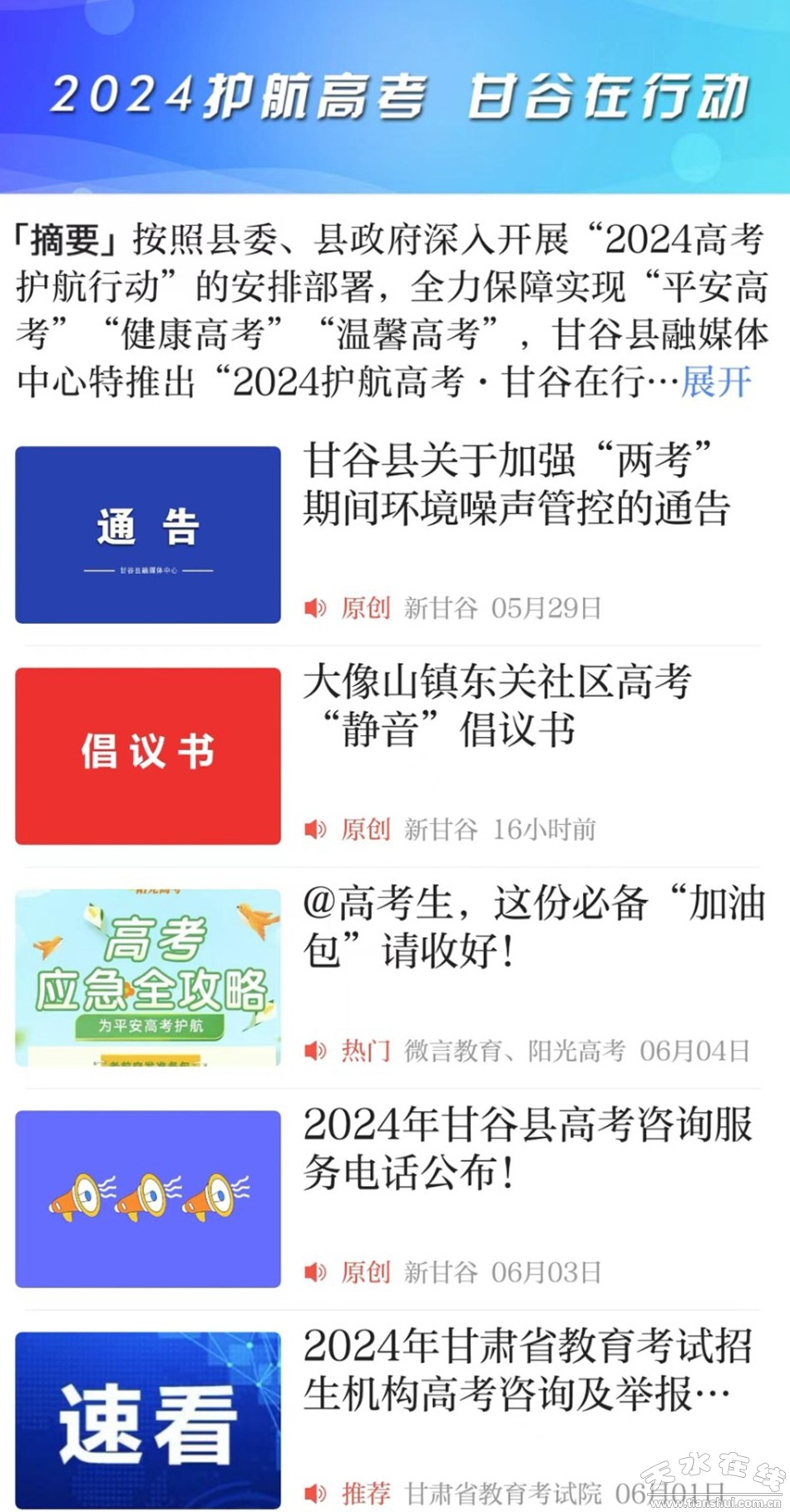 甘谷县融媒体中心在新甘谷客户端开设了“2024护航高考·甘谷在行动”专栏,重点围绕高考综合改革和考试招生领域广大考生关心关切,考生们可以轻松获取到最新的高考咨询信息,包括考试组织、政策宣传、咨询服务、志愿填报、通告公告、温馨提示等内容,积极为考生和家长提供权威的政策咨询和细致的考试服务。