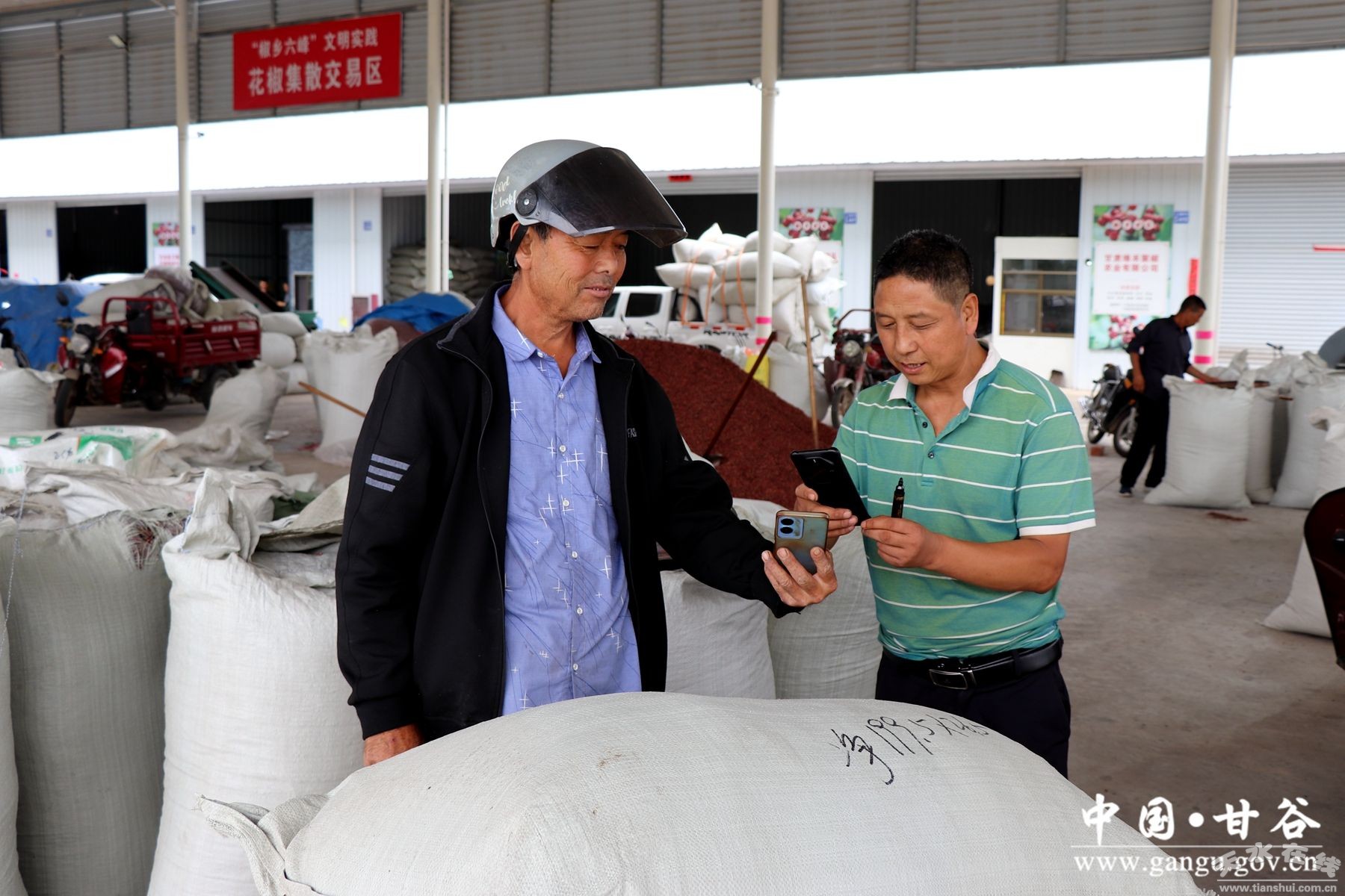 2023年8月,甘谷县六峰镇集花椒交易、仓储物流、加工销售为一体的花椒集散交易中心正式投入使用,吸引了31家花椒经理人入驻,将交易中心建在了群众“家门口”。黄五一是甘谷县六峰镇六峰村村民,花椒是他家里的主要收入来源,今年家里的花椒产量增加,交易中心也建在了家门口,他直呼太方便了。