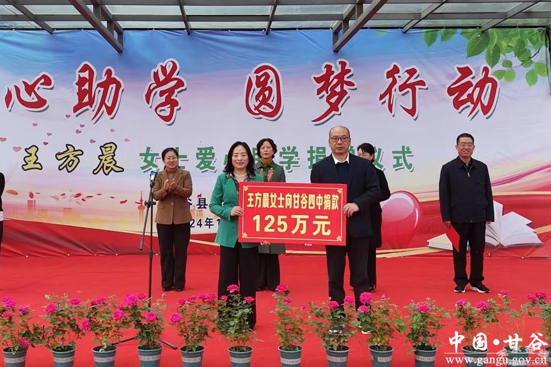 据了解,王方晨女士为甘谷四中捐赠125万元,其中15万元用于建设电子备课教室,110万元设立“晨光基金”,用于奖励在每年高考中取得优异成绩的教师和学生,为家乡教育事业的发展提供助力。