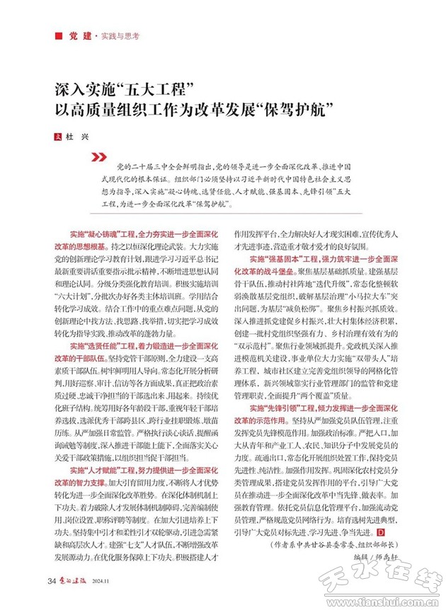 党的二十届三中全会鲜明指出,党的领导是进一步全面深化改革、推进中国式现代化的根本保证。组织部门必须坚持以习近平新时代中国特色社会主义思想为指导,深入实施“凝心铸魂、选贤任能、人才赋能、强基固本、先锋引领”五大工程,为进一步全面深化改革“保驾护航”。