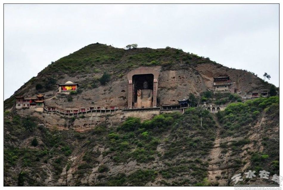 大像山是秦岭西端一支独立的余脉,一峰突起,巍峨挺拔,因山巅“石崖上有大像一躯,长八丈,自山顶至山下一千二百三十尺。”故称大像山。这是宋代乐史《太平寰宇记》中对大像山的记载,也是目前能看到的最早明确记载大像山的文字。然而,这段记述并没有说明大像山大佛开凿的具体年代。不是因为疏忽,而是因为没有确切的证据,古人落笔是慎重的。那么大像山大佛究竟开凿于何时呢?当我们把追询的目光稍稍转向与此相距不远的麦积山时,一篇关于麦积山佛龛的铭文:《秦州天水郡麦积崖佛龛铭》,让人们惊喜地发现了一些蛛丝马迹。北周保定五年(公元565年),大都督李允信在麦积山“为亡父造七佛龛”,其规模宏大,堪称麦积山石窟之首。龛成,著名文学家庾信专为其撰铭,其中有“冀城余俗,河西旧风”的句子。冀城,即北朝时的甘谷,“河西”指整个黄河以西,包括整个渭河流域及“陇坻”的麦积山广大地区。“余俗”与“旧风”说明,至少在北朝时甘谷佛教已经十分昌盛,开窟造像的条件也已具备,同时,专家又进一步从大佛像外貌形态方面论证了大像山大佛泥妆于盛唐。于是,开凿于北魏,彩妆于盛唐,成为人们对甘谷大佛普遍的共识。这一认识至少有两点意义:甘谷大佛是渭河流域唯一的一尊唐代大佛,是甘肃石窟长廊不可或缺的一笔,同时也填补了麦积山石窟没有唐代大佛的缺憾。