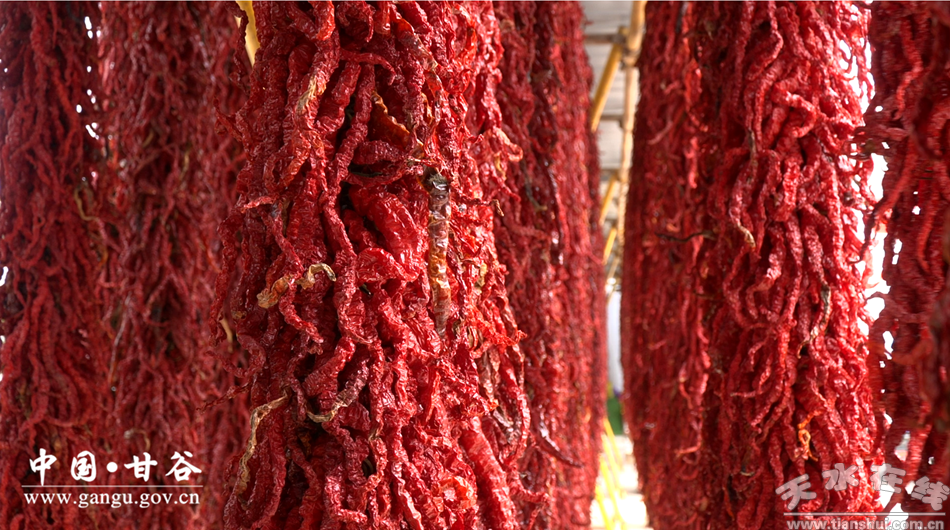 在甘谷县的一家辣椒加工厂,椒香混合着机器的运转声扑面而来,新鲜采摘的辣椒在这里经过分拣、清洗、烘干等一道道工序,再根据产品需求,或送入传统石碾研磨成面,或通过自动化设备切割成段、成丝,最终变身成为各类深受市场欢迎的辣椒制品。