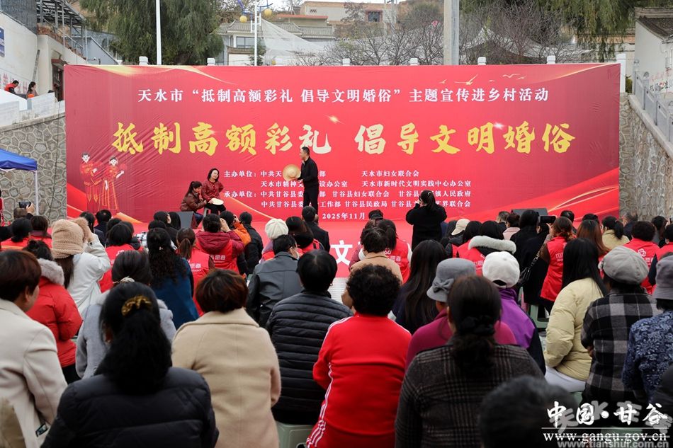 新甘谷讯【记者李宛郁】11月12日,由天水市委宣传部、市妇联、市文明办、市新时代文明实践中心办公室联合举办的天水市“抵制高额彩礼倡导文明婚俗”主题宣传进乡村活动在甘谷县新兴镇孙家坪村举行。这场别开生面的主题宣传进乡村活动,凭借欢快的文艺演出、趣味的知识互动、贴心的便民服务与暖心的文化赠送,让200多名乡亲在欢声笑语中,卸下了高额彩礼的沉重负担,筑牢了文明婚俗的思想根基。