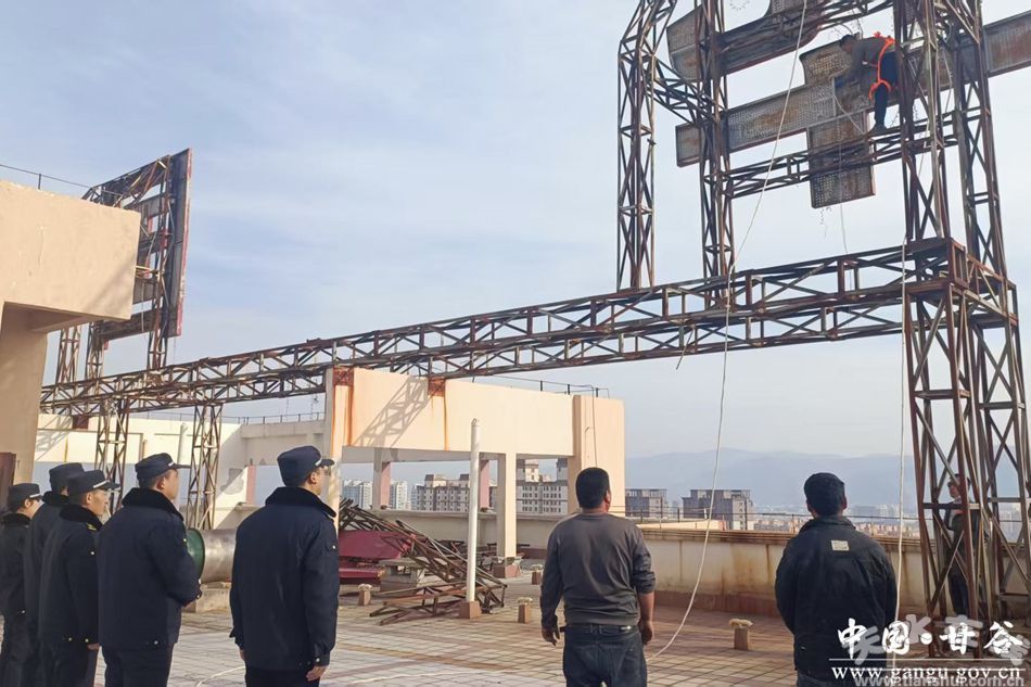 新甘谷讯【记者郭金龙】“高空广告牌看着不起眼,一旦掉下来就是大祸!”近日,甘谷县城市管理执法队聚焦高层建筑安全隐患,在全县开展楼顶广告牌专项排查行动。排查中,执法人员发现华恒国际大楼楼顶的大型广告牌存在支架锈蚀、固定件腐朽等严重问题,成为悬在市民头顶的“定时炸弹”。经过执法队员多次上门宣讲政策、耐心动员劝导,开发商最终充分理解并积极配合,高危广告设施被顺利拆除,及时消除了安全隐患。