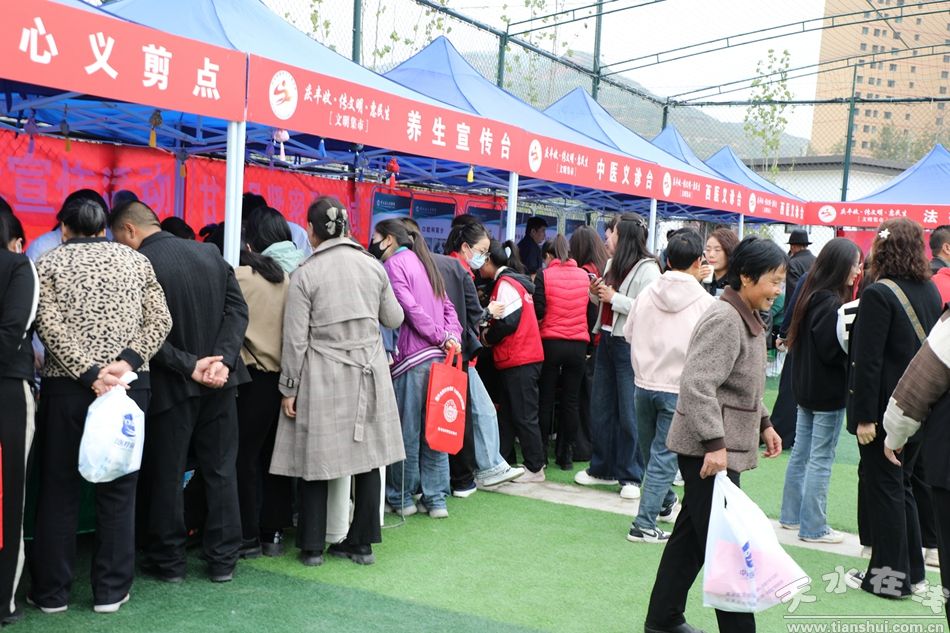 “大爷,您的血压有点偏高,平时要少吃盐、多运动,记得按时吃药。”“大姐,这是最新的苹果种植技术手册,里面有病虫害防治的法子,照着种保准能丰收。”在农民丰收节期间,甘谷县“庆丰收传文明惠民生”文明集市热闹开集,政策宣讲台、非遗展示区、健康义诊点、农技咨询处……10多个服务点位前挤满了群众,志愿者忙碌的身影穿梭其间,把服务送到群众家门口,把文明种进百姓心坎里。