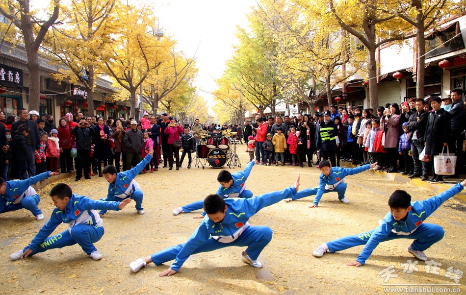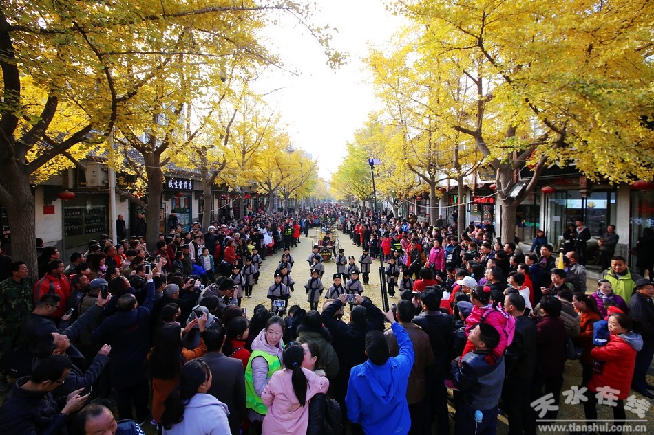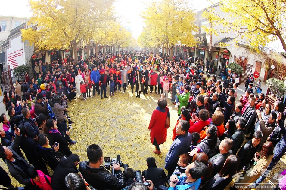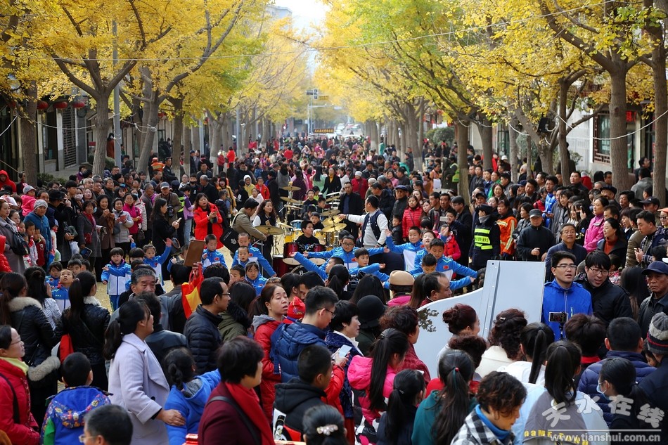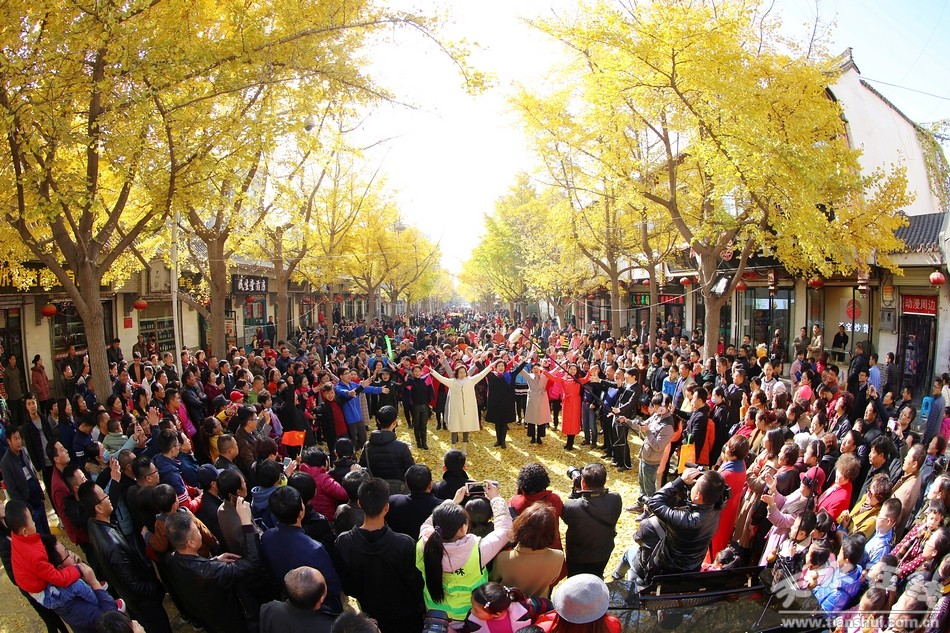 初冬的大道上,银杏叶在风中摇曳,有的落地如黄金踩上去却软绵绵,有的已被游人踩成粉末乍看像地毯一般,明媚的阳光撒满整条大道和两旁的仿古建筑,宛如人间仙境。游人们依然激情饱满,锣鼓喧天,现场的氛围有增无减,男女老少脸上都洋溢着灿烂的笑容,尽情的享受着冬日暖阳下的这场“狂欢”。此刻的画面,真让人心动。