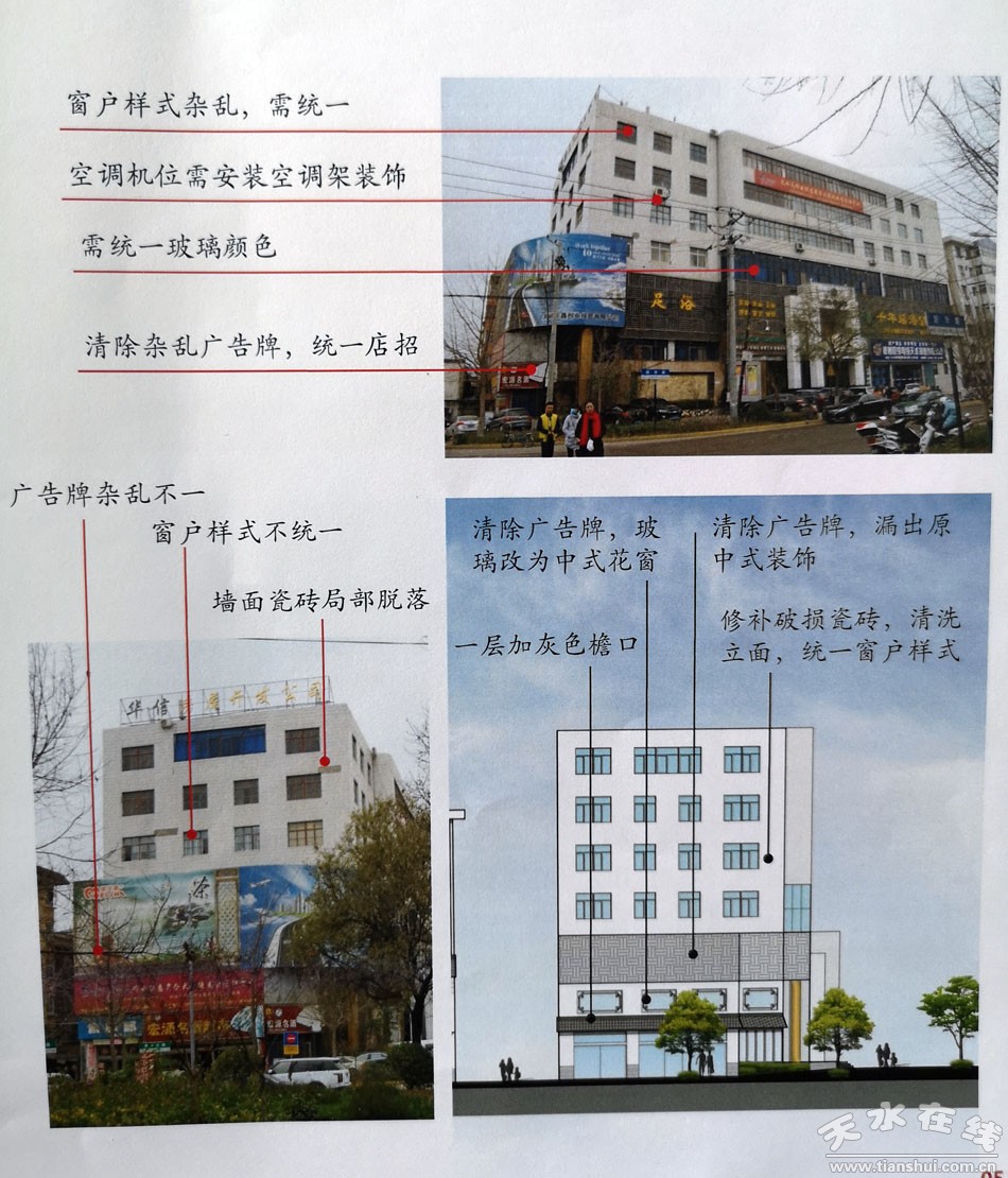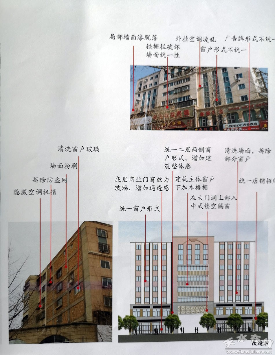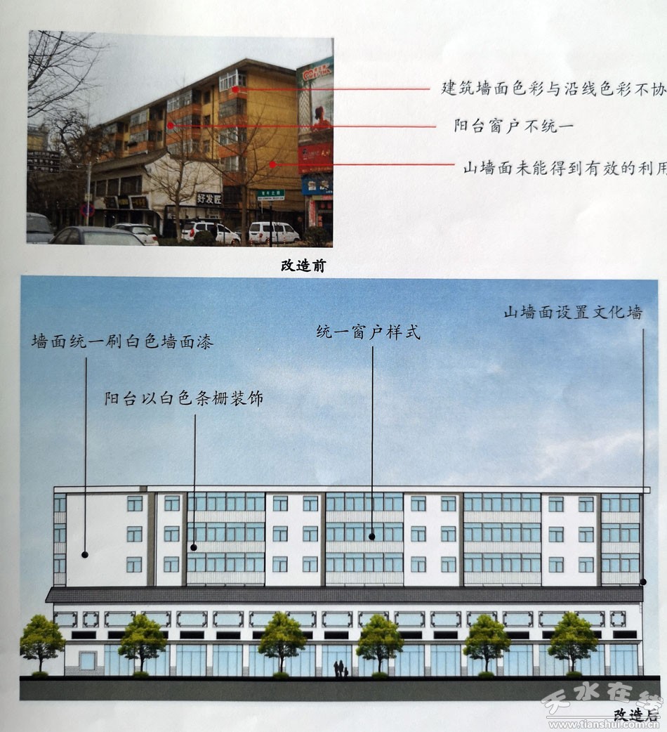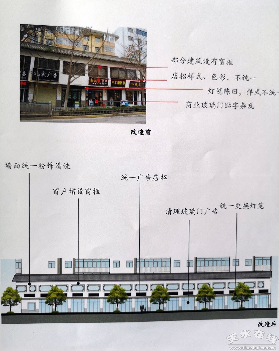 天水在线12月12日报道 上图为秦州区青年南北路街景改造效果图。据悉,秦州区将于2019年1月10日至29日,总工期20日历天,对青年南北路街景进行改造。项目概算为837.74万元;项目范围为天水市秦州区青年南北路长915m;项目规划对青年北路建筑进行立面改造,其余建筑以粉刷、清洗为主,青年南路建筑以修补、粉刷、清洗为主,统一广告标识等。
