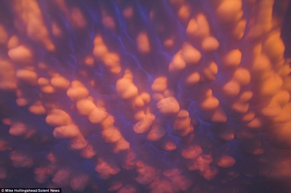 据英国《每日邮报》11月20日报道,一位来自美国内布拉斯加州的风暴追逐者Mike Hollingshead拍摄了一组令人难以置信的天空中“云泡沫”的照片。据了解,这些云彩被称为是“乳状云”,是雷暴天气过后才能出现的罕见的云彩状态。(网页截图) |
