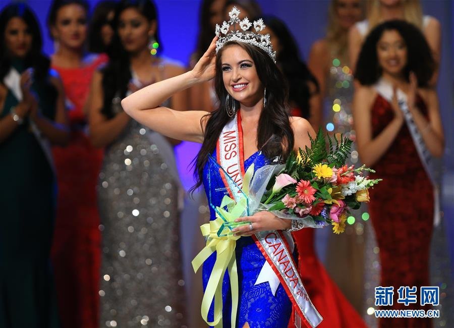 6月11日,在加拿大多伦多,西拉·贝尔切尔庆祝夺冠。当日,2016年加拿大环球小姐选美大赛决赛在多伦多落幕,来自萨斯喀彻温大学的20岁学生西拉·贝尔切尔夺得冠军。 新华社发(邹峥摄)