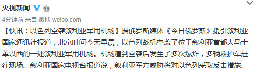 【快讯:以色列空袭叙利亚军用机场】据俄罗斯媒体《今日俄罗斯》援引叙利亚国家通讯社报道,北京时间今天早晨,以色列战机空袭了位于叙利亚首都大马士革以西的一处叙利亚军用机场。机场遭到空袭后发生了多次爆炸,多辆救护车赶往现场。叙利亚国家电视台报道说,叙利亚军方威胁将对以色列采取反击措施。
