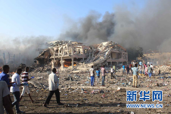 这是10月14日在索马里首都摩加迪沙市区萨法里酒店附近拍摄的爆炸现场。新华社发(费萨尔·伊塞摄)