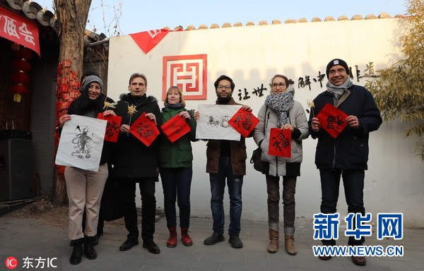 2018年2月6日,北京。铁树斜街93号院博物馆非遗迎新庙会,外国游客展示自己参与的非遗项目成果。